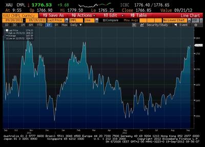 Od 26 lipca, kiedy to Mario Draghi, szef ECB zapowiedział, że instytucja podejmie wszelkie możliwe kroki by obronić euro, cena żółtego kruszcu wzrosła już o ponad 10 proc. Obecnie kształtuje się na poziomie około 1777 USD/u, co tylko o 1 dolara jest mniejsza wartością od szczytu z 29 lutego.
