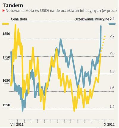 Analitycy TD Securities zwracają uwagę, że notowania kruszcu naśladują wskaźnik oczekiwań inflacyjnych. Wzrósł on do najwyższego poziomu od 16 miesięcy, po tym jak amerykańska Rezerwa Federalna ogłosiła trzecią rundę rozluźnienia polityki pieniężnej (tzw. QE3) i zapowiedziała zintensyfikowanie zakupów papierów, zabezpieczonych hipotekami (tzw. MBS).