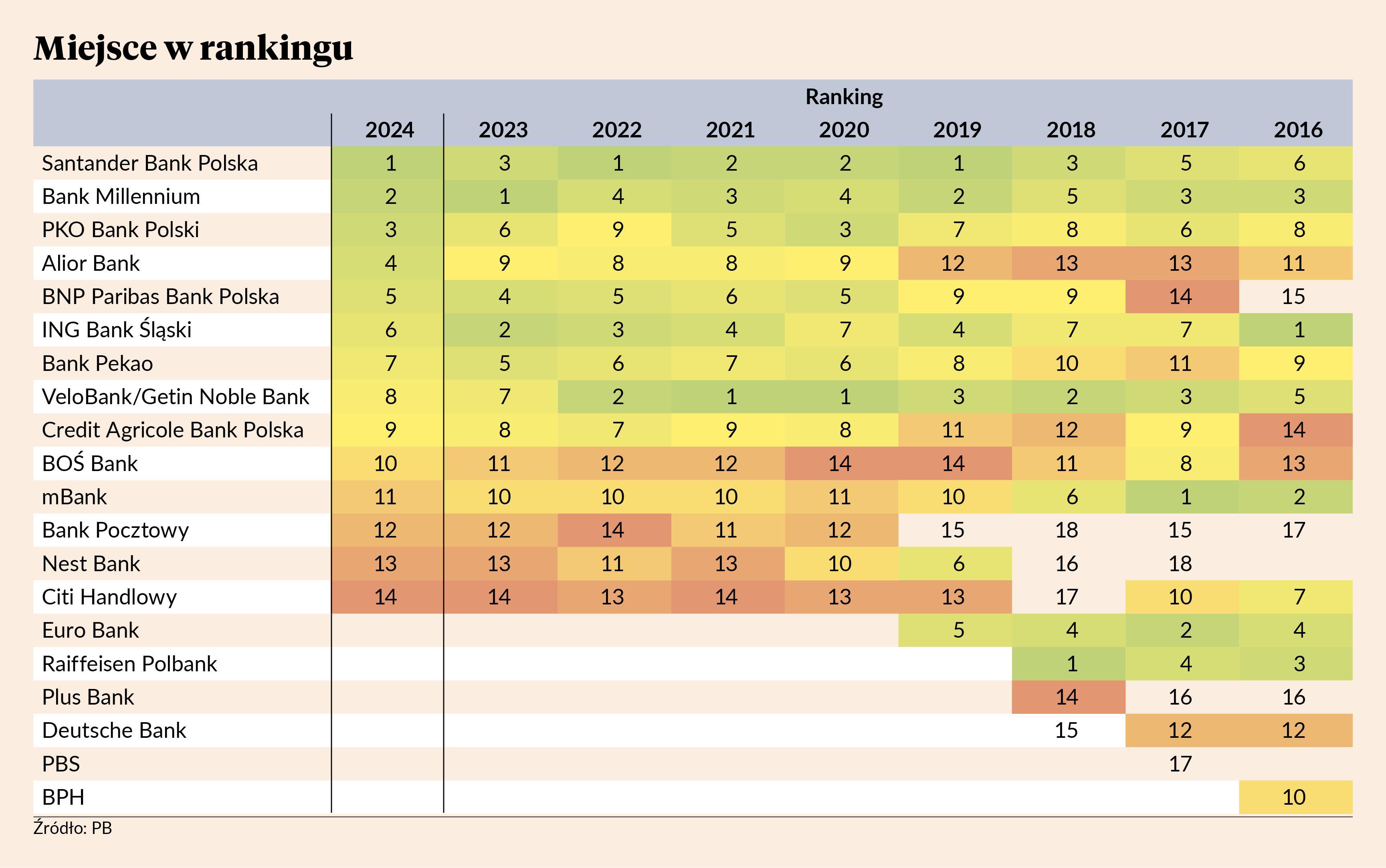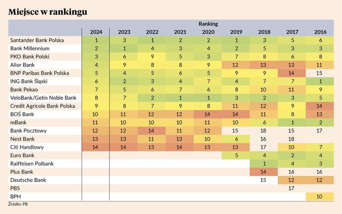 Słabiej niż w poprzednich latach wypadł VeloBank, spadkobierca Getinu, dwukrotnego zwycięzcy rankingu. Można to jednak położyć na karb zmian właścicielskich, jakie przechodził.