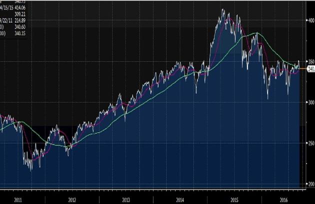 Wykres wskaźnika Stoxx Europe 600 z zaznaczonymi średnimi – 50-sesyjną (linia różowa) oraz 200-sesyjną (linia zielona). Wyjście linii różowej ponad zieloną oznacza tzw. złoty krzyż.