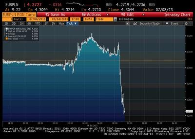 O godz. 15:22 euro kosztowało już 4,27 zł, czyli cztery grosze mniej niż przed wystąpieniem prezesa EBC. Umocnienie złotego jest wynikiem nagłego osłabienia się euro.