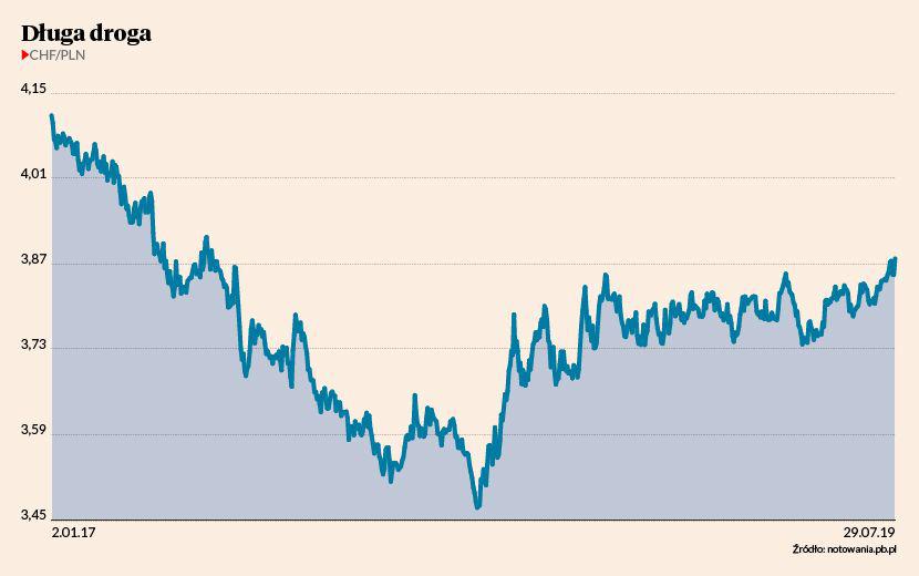 Rodzime banki nie notują zwiększonego napływu pozwów od klientów — posiadaczy kredytów denominowanych w szwajcarskiej walucie. Frank idzie jednak systematycznie w górę i temat może wrócić na tapetę, zwłaszcza jeśli dla frankowiczów korzystny okaże się wyrok TSUE w sprawie niedozwolonych klauzul w umowach kredytowych. We wtorek 30 lipca notowania CHF/PLN wzrosły do 3,89 zł, są o ponad 2 proc. wyższe niż na początku roku, najwyższe od dwóch lat i mniej więcej w połowie drogi między dołkiem z 2018 r. i szczytem z „czarnego czwartku” 15 stycznia 2015 r. (na zamknięciu kurs spadł do 4,29 zł, w ciągu dnia doszedł jednak do 5 zł).