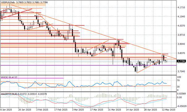 Dzisiaj jednak złoty może być też pod wpływem krajowych danych. Już o godz. 10:00 Główny Urząd Statystyczny opublikuje szacunkowe dane o wzroście PKB w I kwartale, a także finalne dane o inflacji CPI za kwiecień. Szacuje się, że tempo wzrostu gospodarczego nieco wyhamowało - do 0,1 proc. k/k i 3,1 proc. r/r. Słabsze dane osłabią złotego, a lepsze mogą go nieco podbić - rynek będzie intepretował je przez pryzmat potencjalnego nastawienia RPP do obniżek stóp procentowych. Niemniej w szerszym (kilkunastodniowym) ujęciu to nadal kluczowe będą informacje z rynków globalnych (czy uda się utrzymać sentyment wobec ryzyka) i tym samym zachowanie się pary EURUSD.