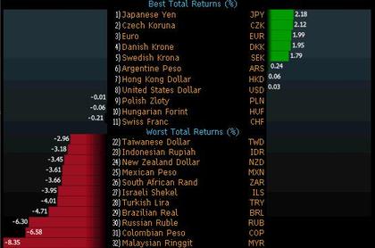 Stopy zwrotu z głównych walut za sierpień po uwzględnieniu różnic w stopach procentowych. Źródło: Bloomberg.