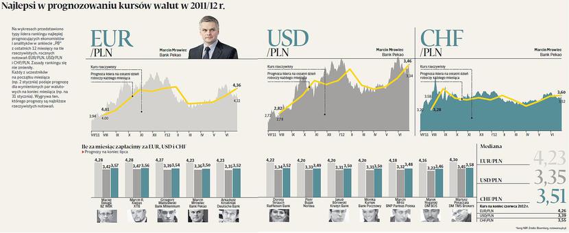 Tymczasem sytuacja zmieniłasię jak w kalejdoskopie i pod koniec czerwca kurs EUR/PLN zszedł do nieco ponad 4,26 zł. Tego nie prognozował nikt, a najbliżej był Jakub Borowski z Kredyt Banku, który typował kurs 4,30 zł. Teraz specjalista również prognozuje umocnienie, ale zaledwie w symbolicznej skali. Jego zdaniem, za miesiąc za euro trzeba będzie zapłacić 4,20 zł.