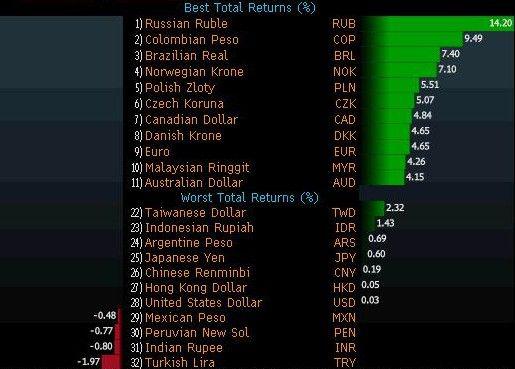 Najwięcej inwestorzy walutowi zarobić mogli na obstawianiu umocnienia rubla. Rosyjska waluta, która w poprzednich 12 miesiącach straciła 31,8 proc. wartości, umocniła się aż o 14,2 proc. Listę wygranych zdominowały waluty europejskie. Dzięki poprawie koniunktury w strefie euro wspólna waluta i powiązana z nią korona duńska zyskały po 4,6 proc., a odbicie cen ropy naftowej pozwoliło na 7,1-procentowe umocnienie korony norweskiej. Prawie tyle co złoty zyskała korona czeska.