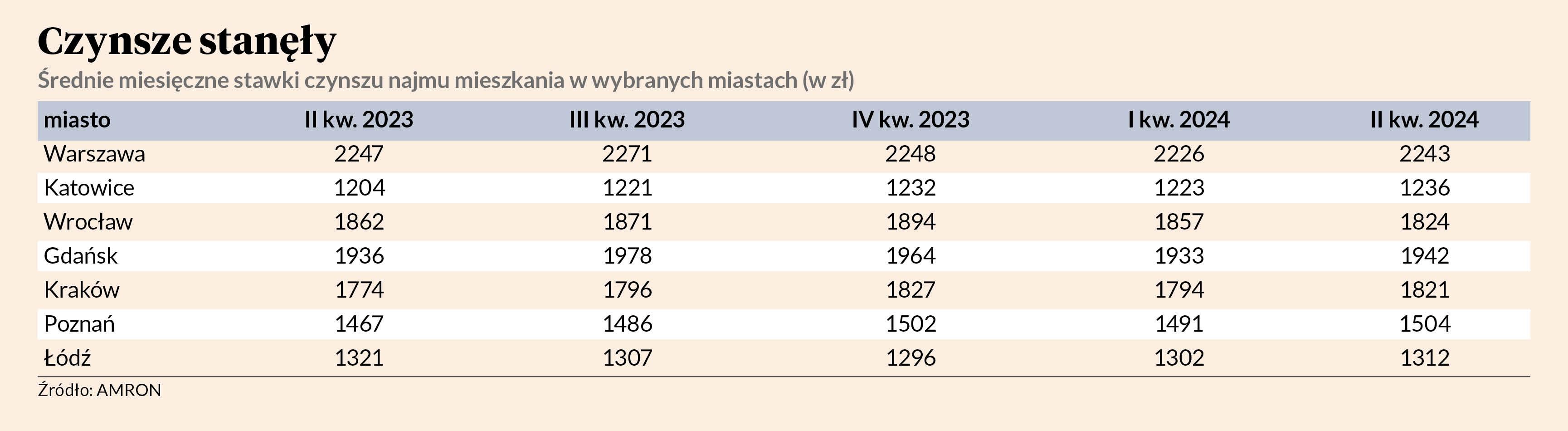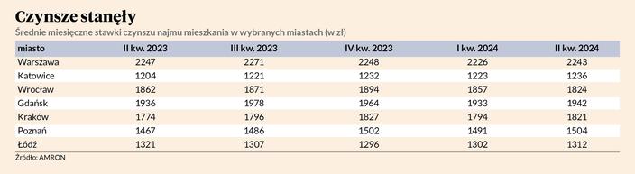 W przypadku stawek czynszów mieszkań na wynajem autorzy raportu dostrzegają pełną stabilizację, która utrzymuje się już prawie od półtora roku. W II kw. zanotowano nieznaczne podwyżki czynszów w porównaniu z I kw. — najwyższe w Krakowie (o 1,51 proc.) i Katowicach (o 1,06 proc.), gdzie średni czynsz najmu wzrósł o 27 zł i 13 zł. W Warszawie średni czynsz