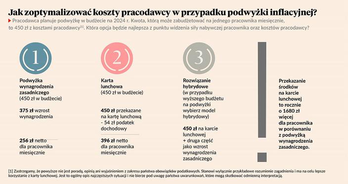 Przełom 2023 i 2024 r. to najlepszy czas, aby zaplanować budżet firmy, który uwzględni potrzeby pracowników i sytuację rynkową, przy jednoczesnej optymalizacji kosztowej. Warto wykorzystać siłę tego benefitu przy podwyżkach inflacyjnych, ale też obserwując dane rynkowe — w Polsce mamy największą inflację związaną z żywnością, zatem wsparcie w tym sektorze jest niewątpliwie działaniem na plus dla każdej firmy. Wiemy też, że sami pracownicy wolą otrzymać środki na karcie lunchowej ze względu na to, że wysokość środków przekazanych na karcie może być wyższa nawet o 1688 zł rocznie vs podwyżka w tej samej kwocie. Prosty przykład pokazuje, że karta lunchowa to benefit „must have” dla każdej nowoczesnej firmy, dzięki któremu zyskają wszyscy: działy HR, mające pewność wyboru dobrego benefitu, z którego pracownicy korzystają, działy finansowe, które realnie zwiększą oszczędności organizacji, pracownicy — zyskujący zarówno finansowo, jak i zdrowotnie.