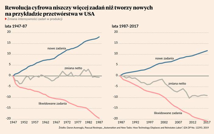 Z czysto ekonomicznego punktu widzenia kluczowe jest to, czy technologia podnosi tylko średnią wydajność pracy, czy też równocześnie zwiększa tzw. krańcową wydajność pracy. Średnia wydajność oznacza ilość produkcji w przeliczeniu na pracownika, a krańcowa wydajność – ilość dodatkowej produkcji możliwej do wytworzenia przez jednego dodatkowego człowieka. Jeżeli maszyny zastępują ludzi, rośnie średnia wydajność, a jeżeli uzupełniają ludzi, rośnie też krańcowa wydajność. Acemoglu Johnson przekonują, że przez pierwsze 100 lat rewolucji przemysłowej, czyli do ok. 1980 roku, postęp technologiczny uzupełniał zdolności produkcyjne człowieka, prowadził do zwiększenia krańcowej wydajności. Maszyny przejmowały część zadań, ale jednocześnie pojawiały się nowe zadania. Dzięki temu rosła produkcja, rosło zatrudnienie i rosły wynagrodzenia. Jednak od lat 80, czyli początku rewolucji cyfrowej, ten trend się zmienił. Zadań związanych z produkcją ubywa, krańcowa wydajność nie rośnie (lub rośnie wolniej). Pokazuję to na wykresie, który zaciągnąłem z innej publikacji autora.