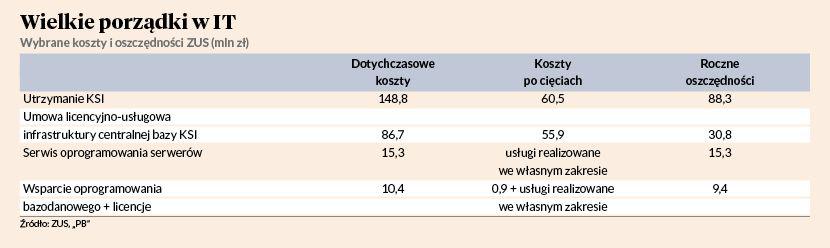 — Działania, które przeprowadziliśmy w ciągu ostatnich miesięcy, owocują oszczędnościami ponad 150 mln zł rocznie, co w perspektywie czterech lat daje możliwość obniżenia kosztów działalności o 600 mln zł. Pierwsze efekty osiągnęliśmy już w ubiegłym roku, zmieniając modele i zapisy postępowań przetargowych. Ostatnie optymalizacje zostały dokonane w styczniu i lutym bieżącego roku. Za uzasadnione należy więc uznać pierwotne tezy prezesa ZUS o wysokich kosztach działalności — mówi Krzysztof Dyki. Jego zdaniem, przerost kosztów spowodował głównie szybki rozwój technologii informatycznych i wzrost znaczenia własności intelektualnej. Praktycznie w każdym obszarze IT było pole do cięć.