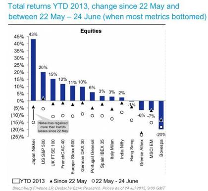 Stopy zwrotu z indeksów akcji od początku roku (granatowy słupek), w okresie przeceny 22 maja - 24 czerwca (zaznaczone kółkiem) oraz od początku korekty do tej pory (zaznaczone trójkątem). Im wyższe położenie trójkąta w stosunku do kółka, tym większą część strat od dna korekty odrobił dany indeks. Źródło: Deutsche Bank/ BusinessInsider.com.