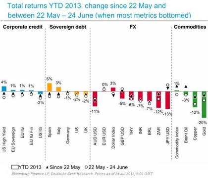 Stopy zwrotu z grup aktywów od początku roku (granatowy słupek), w okresie przeceny 22 maja - 24 czerwca (zaznaczone kółkiem) oraz od początku korekty do tej pory (zaznaczone trójkątem). Od lewej notowania 1) korporacyjnych obligacji spekulacyjnych USA, 2) rządowych w UE, 3) europejskich korporacyjnych o ocenie inwestycyjnej 4) europejskich banków o ocenie inwestycyjnej 5) amerykańskich korporacyjnych o ocenie inwestycyjnej. Kolejne grupy aktywów to obligacje rządowe (słupki żółte), waluty (słupki czerwone) oraz surowce (słupki zielone). Źródło: Deutsche Bank/ BusinessInsider.com.