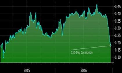 120-sesyjna korelacja między notowaniami ropy brent a indeksem siły walut krajów rozwijających się spadła najniżej od 22 miesięcy. To oznacza, że ceny ropy, które w miesiąc skoczyły o 13 proc., nie dają już rady napędzać hossy na walutach gospodarek wschodzących. Brazylijski real i rosyjski rubel, powiązane z ropą waluty, które od początku roku zyskały do dolara odpowiednio 19 proc. oraz 20 proc., w skali miesiąca utrzymują się tylko na 0,5-procentowym oraz na 4,6-procentowym plusie.