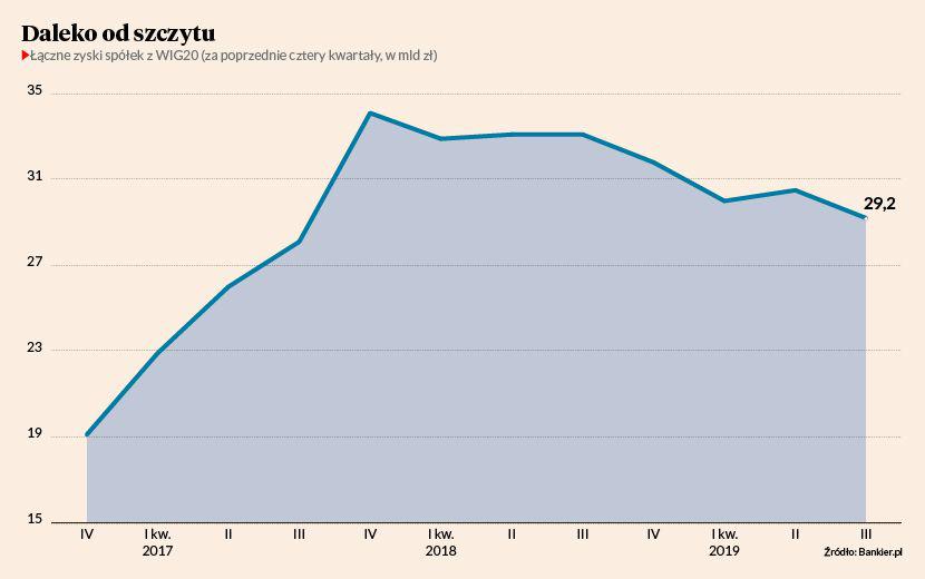 Wchodzące w skład indeksu WIG20 spółki — tzw. blue chipy — wypracowały w III kwartale łącznie 6,37 mld zł zysku netto. To o 19,2 proc. mniej niż w analogicznym okresie przed rokiem. Biorąc pod uwagę 12-miesięczną sumę kroczącą, która pozwala odsezonowić wyniki, zyski w WIG20 sięgnęły po minionym kwartale 29,2 mld zł. To najniższy wynik od III kwartału 2017, a więc równo dwóch lat. Trend spadkowy rozpoczął się po dobrym IV kwartale 2017 r., gdy 12-miesięczna suma zysków sięgnęła aż 34 mld zł (biorąc pod uwagę obecny skład WIG20).