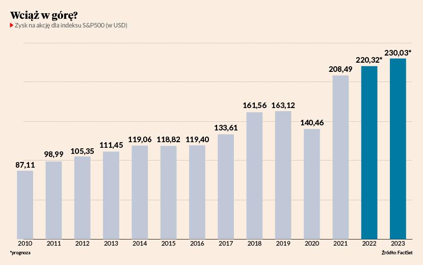 Obecnie indeks S&P500 wyceniany jest na 17-krotność prognozowanych tegorocznych zysków spółek. To wycena o 8 proc. niższa od średniej z ostatnich pięciu lat (18,5) oraz zbieżna ze średnią z minionych dziesięciu lat (17,2). Trudno jednak uznać, że wyceny na Wall Street są okazyjnie niskie. Po pierwsze, ostatnia dekada stała pod znakiem korporacyjnej bonanzy. Między rokiem 2010 a 2021 EPS dla indeksu S&P500 wzrósł prawie o 140 proc. Po drugie, był to okres rekordowo niskich stóp procentowych w USA, co umożliwiało osiągnięcie wysokich wskaźników C/Z na rynku akcji. W przeszłości C/Z dla S&P500 zawierał siew przedziale 11 do 15 jeśli do obliczeń przyjąć zyski oczekiwanie (a nie już zrealizowane). Bieżący mnożnik rzędu 17 nie wygląda więc na okazyjnie niski.